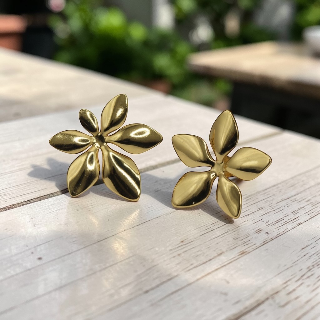Elevate your jewellery game with these Glossy Gold Flower Stud Earrings, crafted to deliver a sleek and modern floral aesthetic. Featuring smooth, high-polish petals arranged in a bold five-petal flower design, these earrings exude understated luxury with a contemporary edge.