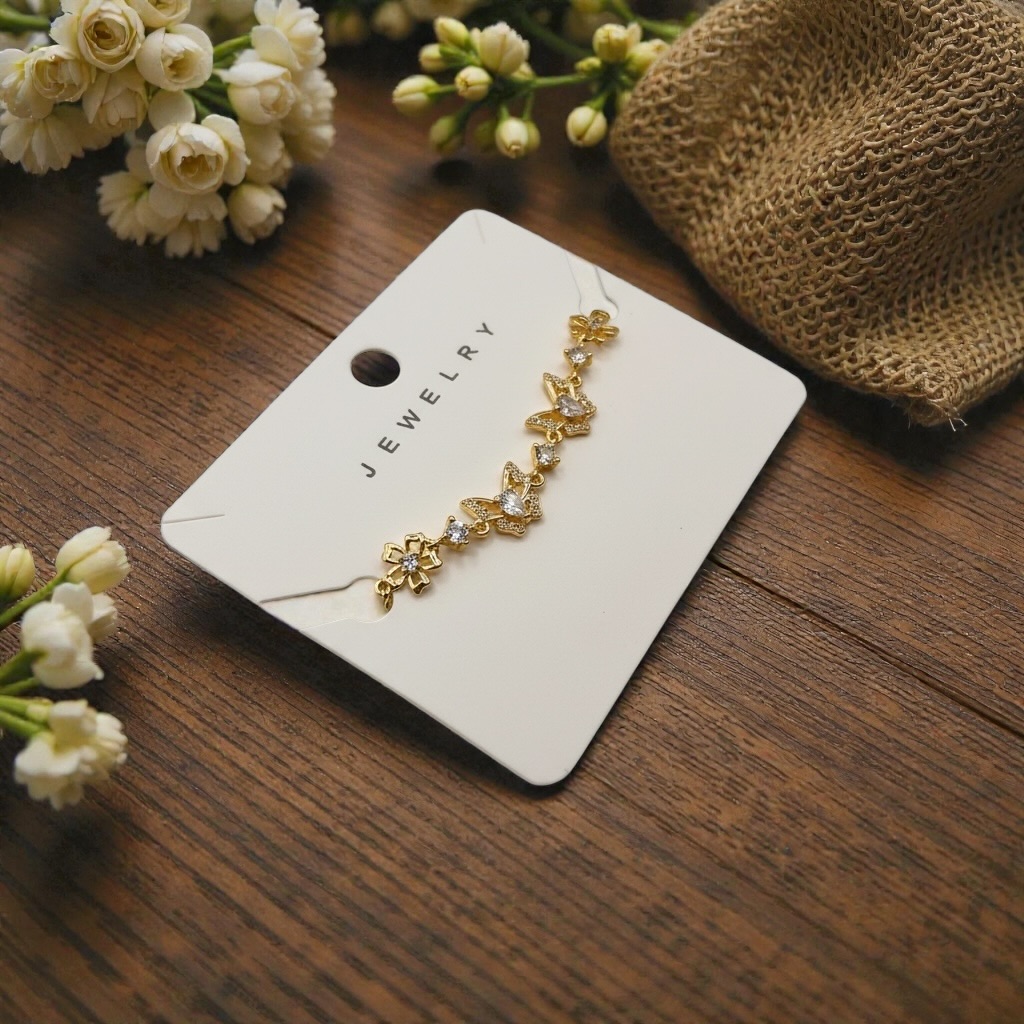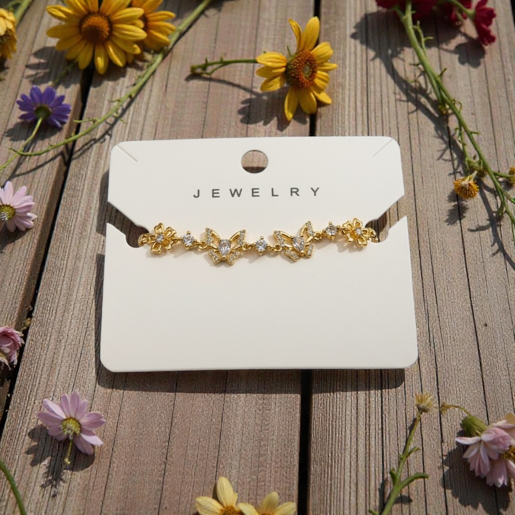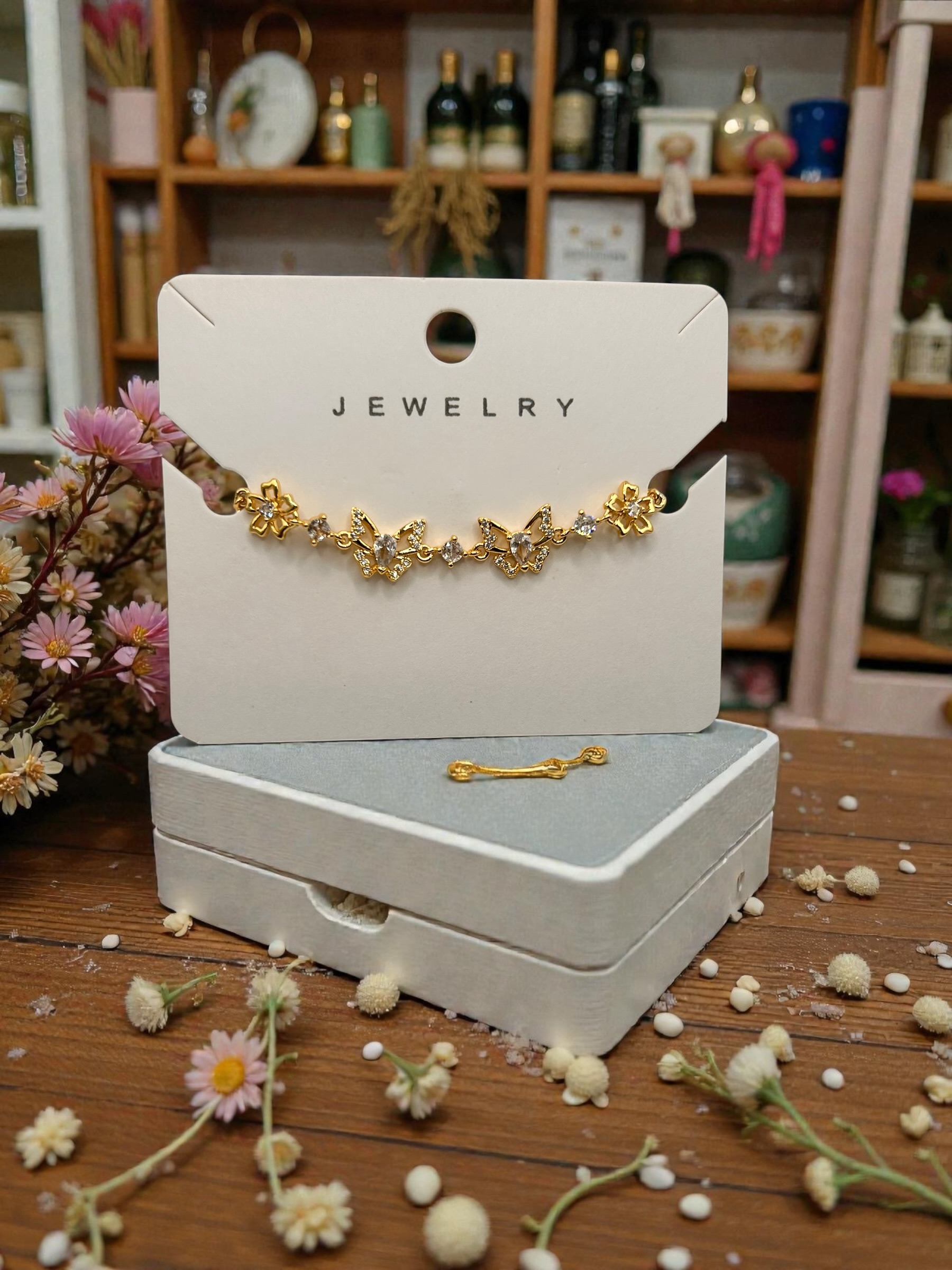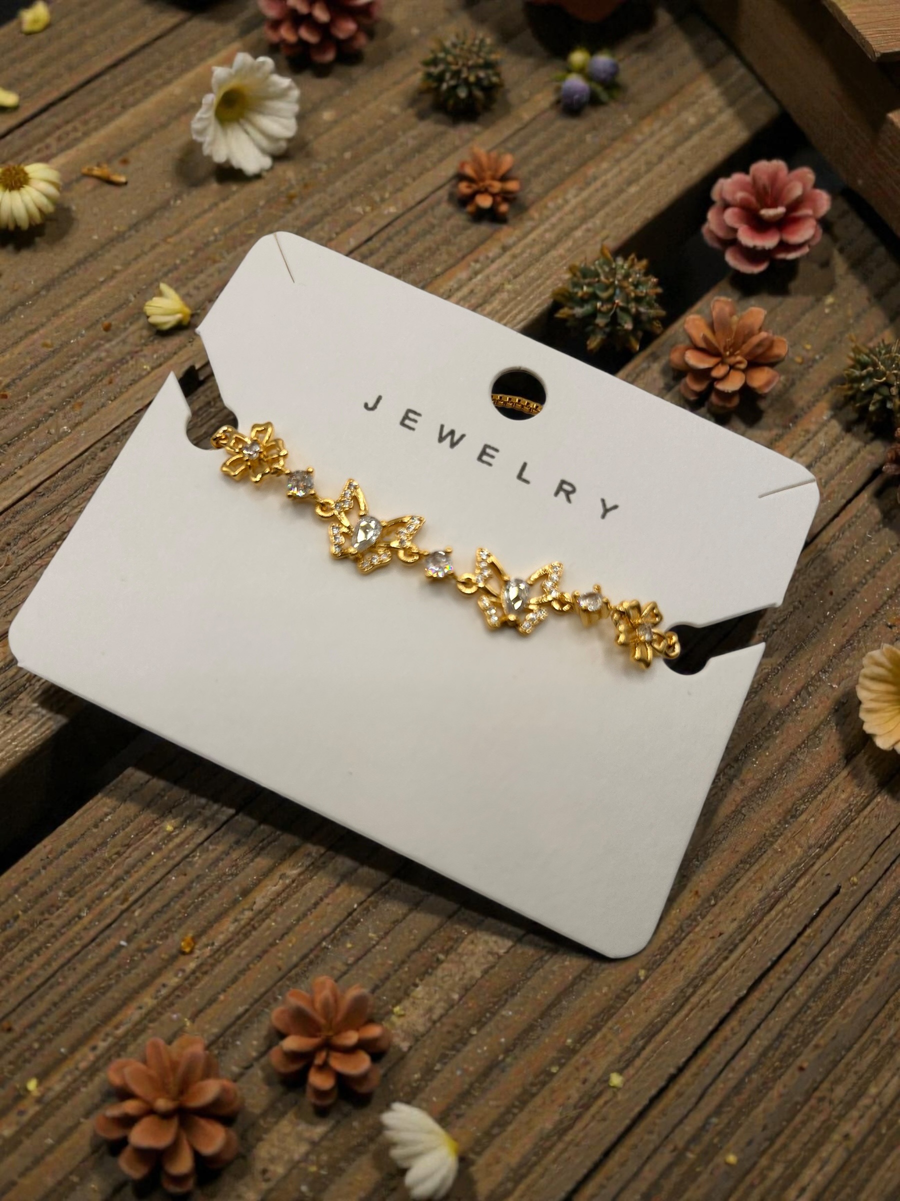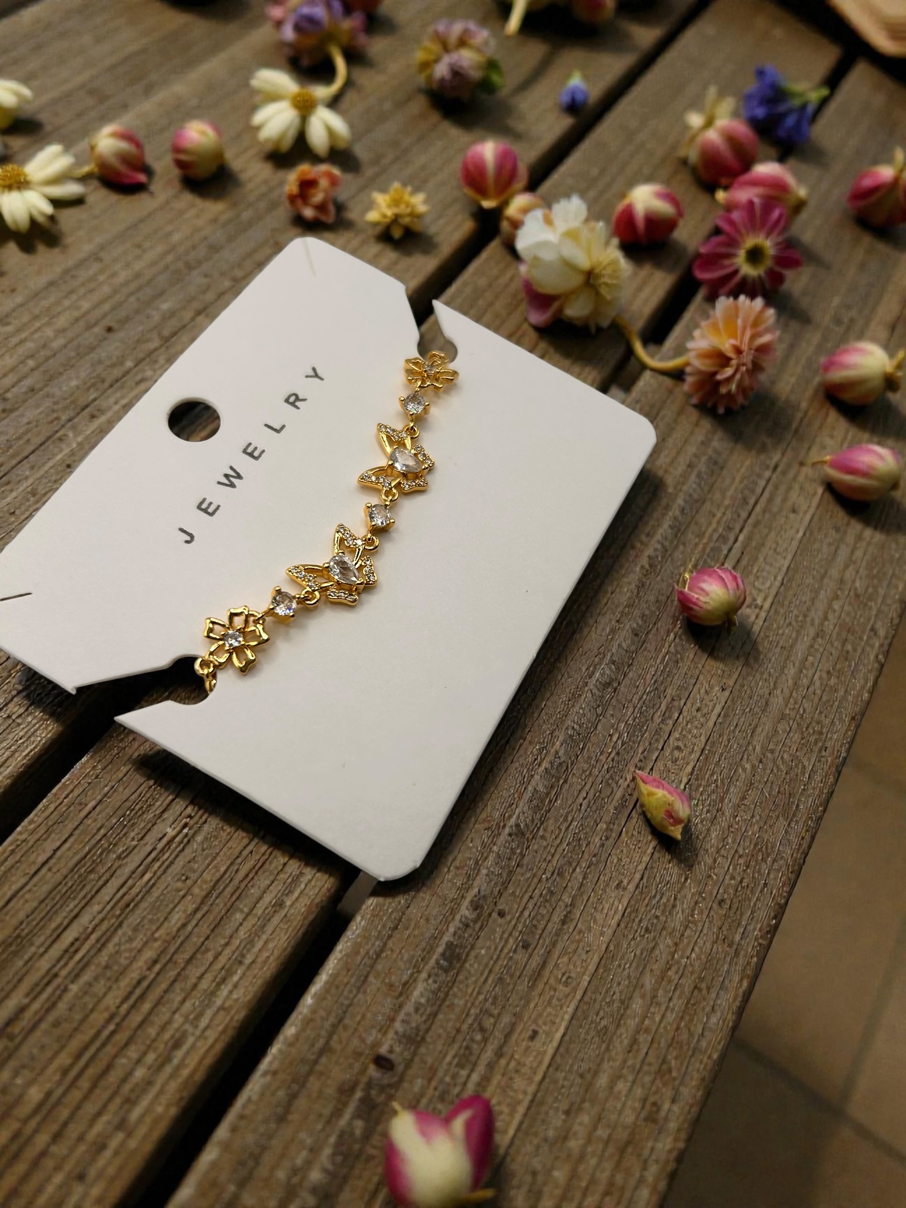 The combination of butterflies and flowers creates a soft, feminine aesthetic that symbolizes beauty, transformation, and elegance. The intricate craftsmanship and shimmering crystals make it a perfect piece for both everyday wear and special occasions. Crafted with a premium gold-tone finish, this bracelet comes with an anti-tarnish coating, ensuring long-lasting shine and durability. Its lightweight structure and adjustable closure provide a comfortable fit for all wrist sizes. Whether worn alone for a minimal elegant look or layered for a trendy style, this bracelet is a must-have accessory for modern jewellery lovers.